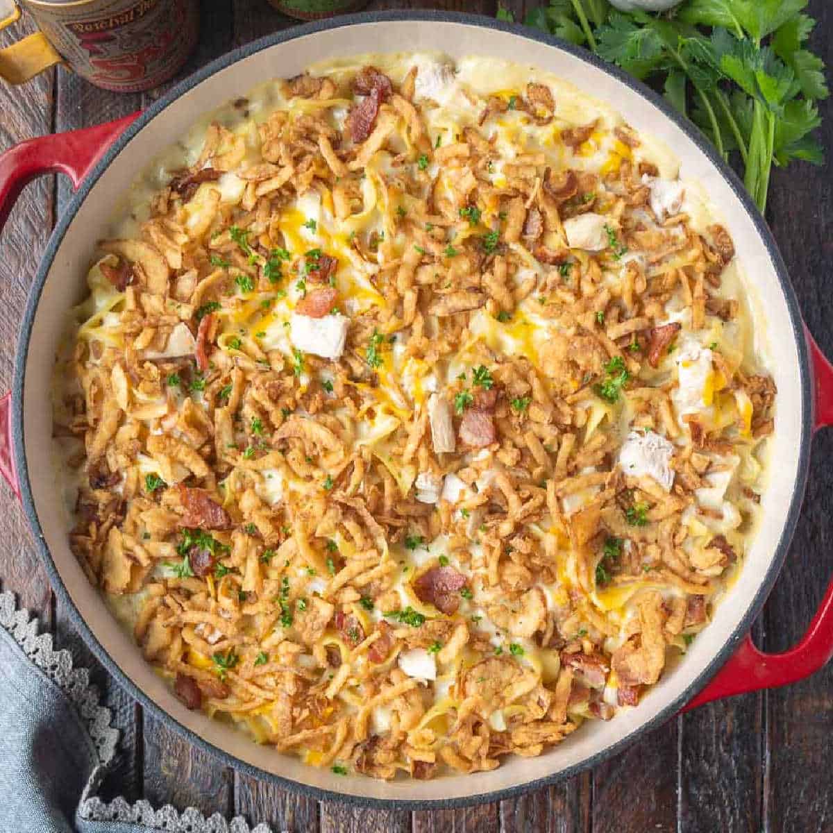 The ultimate chicken casserole uses simple ingredients is cheesy, with a super creamy sauce, and is loaded with tender noodles, chicken, bacon, and corn topped off with some crispy fried onions.