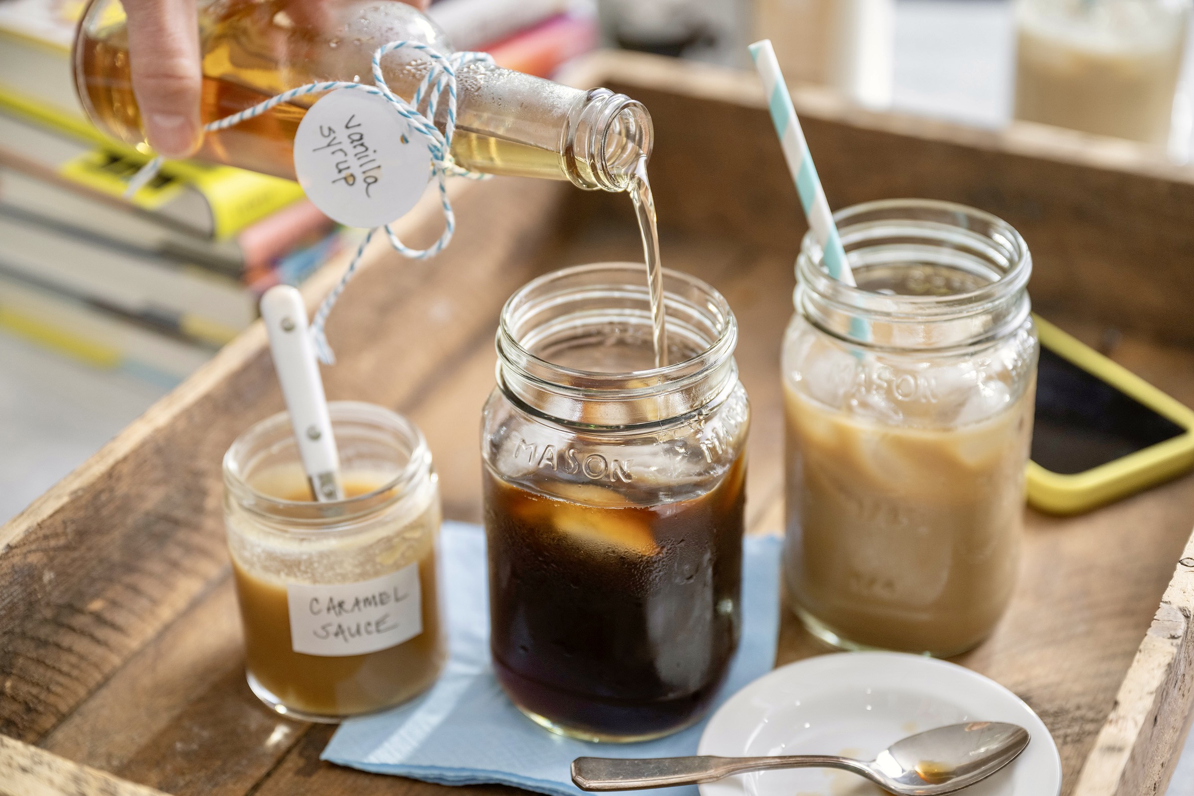 Fill a glass with ice. Add vanilla or caramel syrup (or half and half) and coffee and stir to combine. (If using homemade caramel sauce and it's cold, gently warm to melt before adding to coffee.)