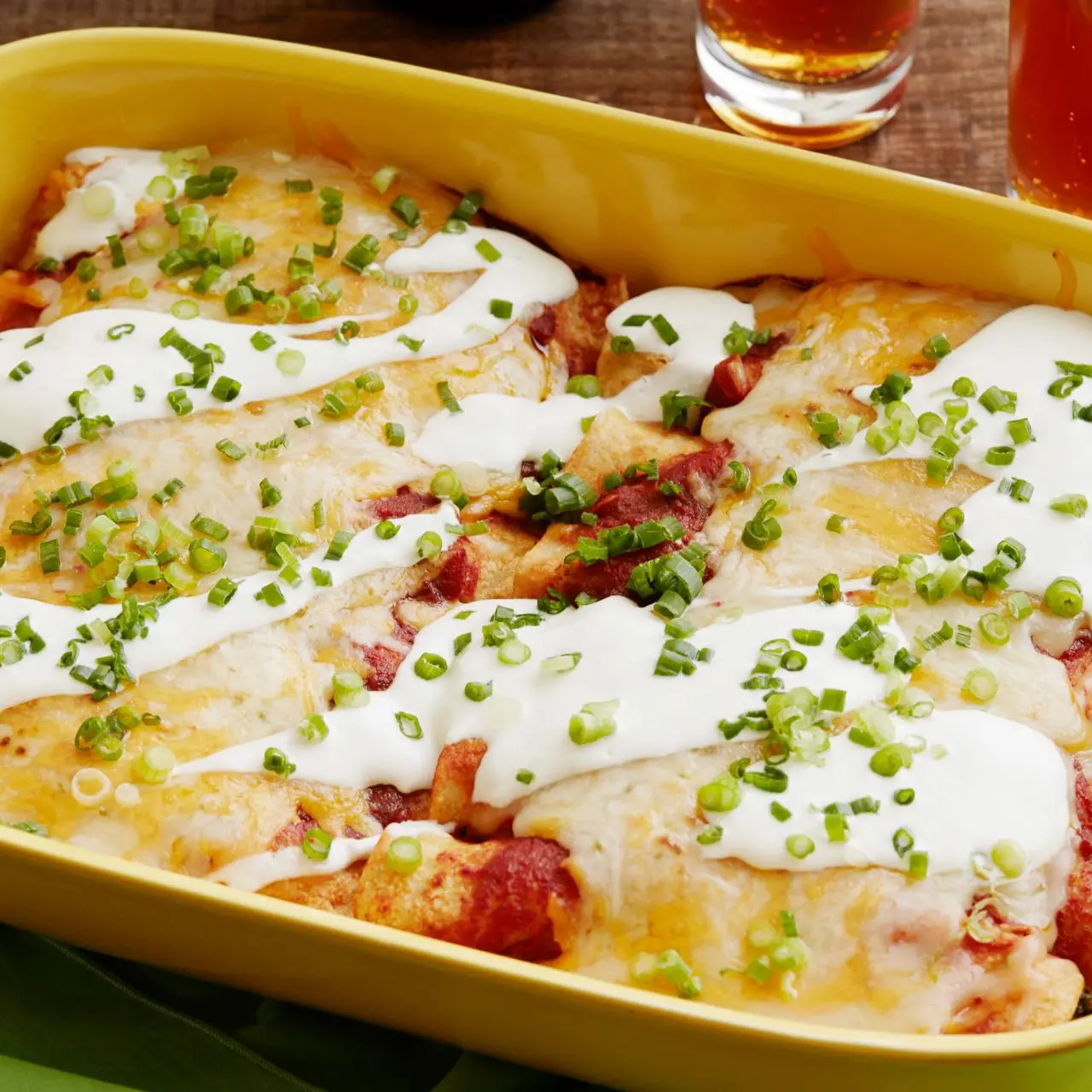For the topping: Whisk together the remaining sour cream, the lime juice and a pinch of salt in a small bowl. Drizzle the mixture over the baked enchiladas, and sprinkle with the remaining scallions.