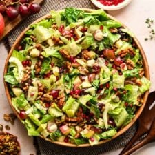 Prep all the salad ingredients: thinly slice your celery, halve your grapes, and cut your apples into roughly 1/2" cubes. Add to a large mixing bowl, pour dressing over the top, and toss to combine. Top with the cooled and broken-up brittle.