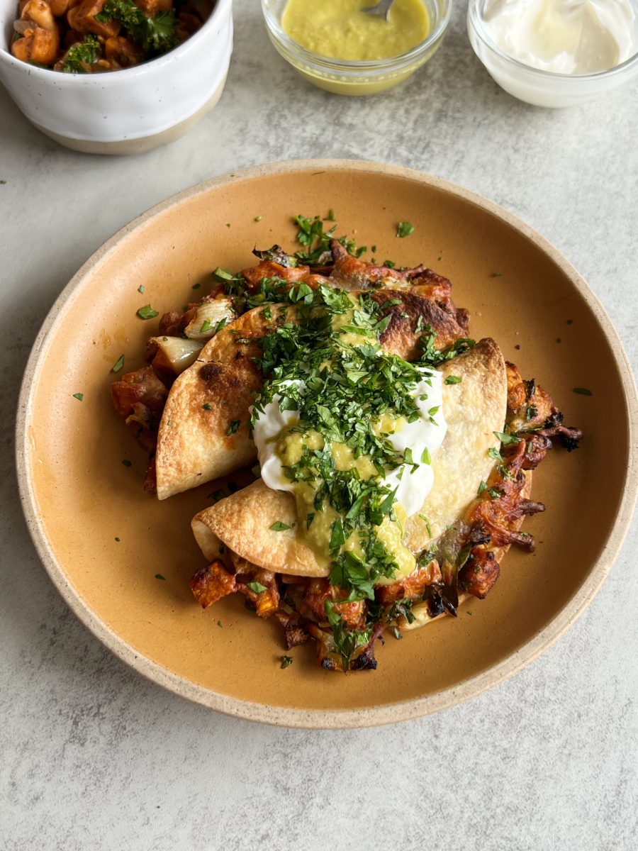 Remove the vegetables from the sheet pan and add your tortillas to the pan. Layer a handful of cheese onto one half of the tortilla followed by some of the bean mixture. Fold the tortilla over and press to hold them down. If the tortillas don't stay folded, you can place another sheet pan on top to hold them down while baking